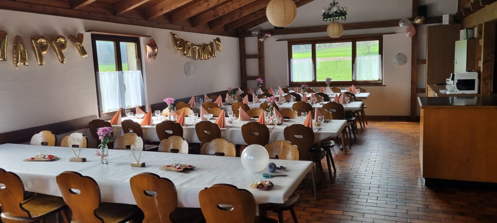 Suchen Sie nach einem besonderen Ort, an dem Sie Ihre nächste Veranstaltung in einzigartiger Atmosphäre ausrichten können? Unser liebevoll eingerichtetes Lokal, idyllisch gelegen und umgeben von Natur, eröffnet Ihnen zahlreiche Möglichkeiten, Anlässe unvergesslich zu gestalten. Ob Jubiläum, Workshop, Seminar, Hochzeit oder Geburtstagsfeier – unser Füürwehrstübli bietet den idealen Rahmen für bis zu 60 Personen.