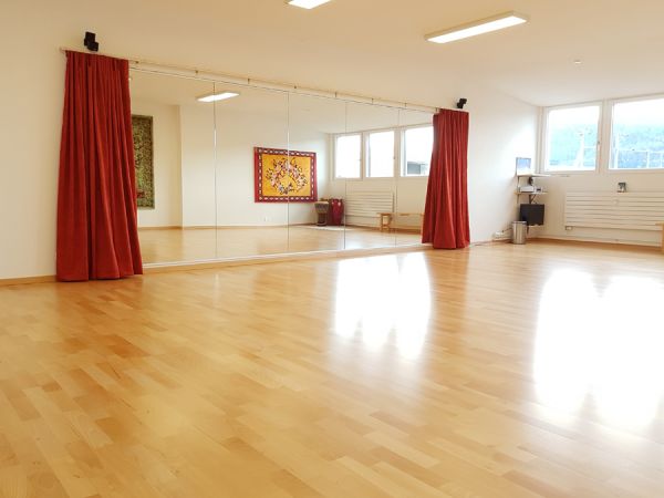 Schöner, grosser und heller Raum ca. 80 m2 ohne Säulen mit Spiegelwand für alle Arten von Bewegung wie Yoga, Taj Chi, Qi Gong, Pilates, Feldenkrais, Meditation, Achtsamkeitskurse etc. Der Raum bietet sich auch an für Gruppentherapie, Coaching und Seminare ...