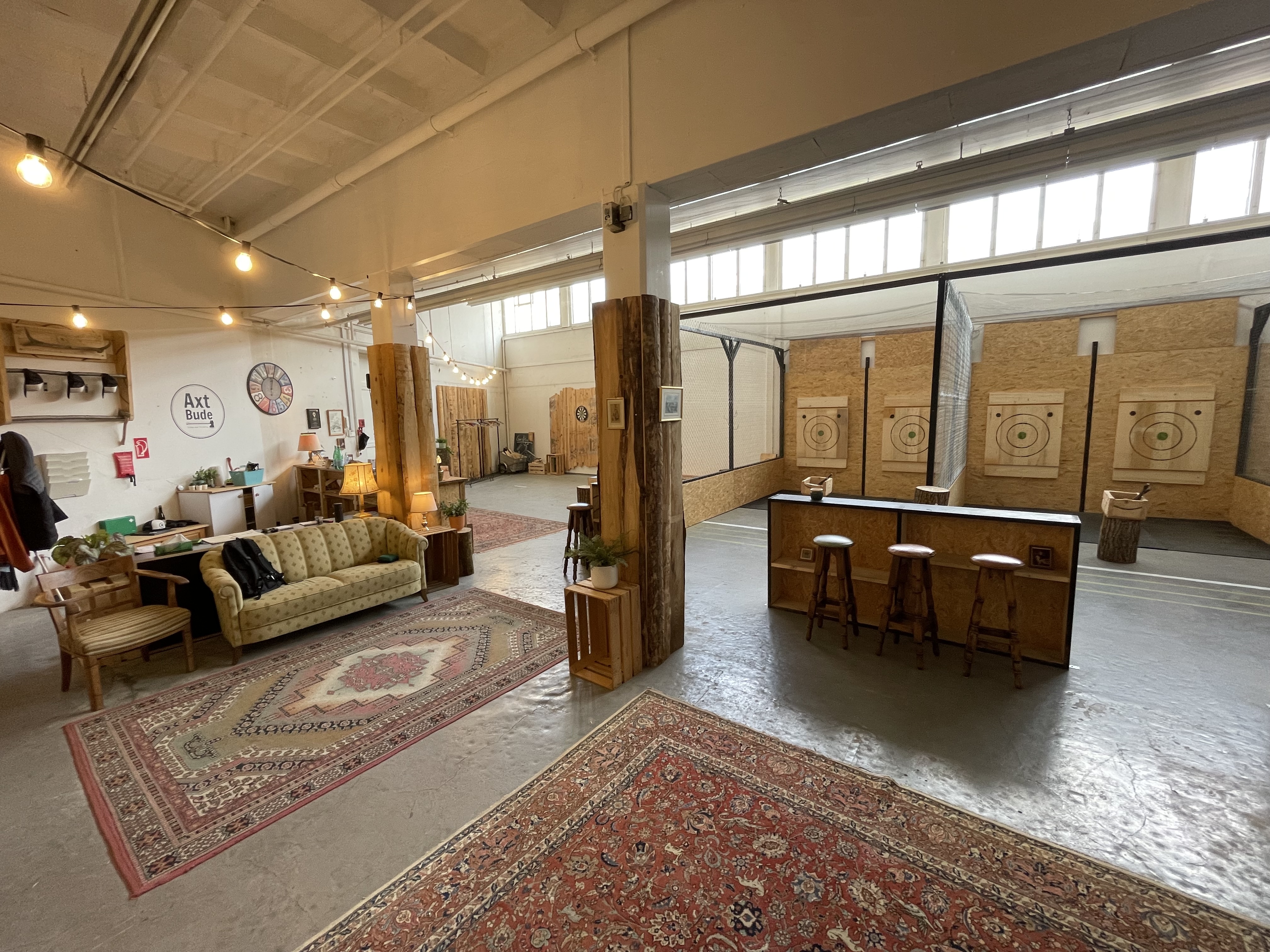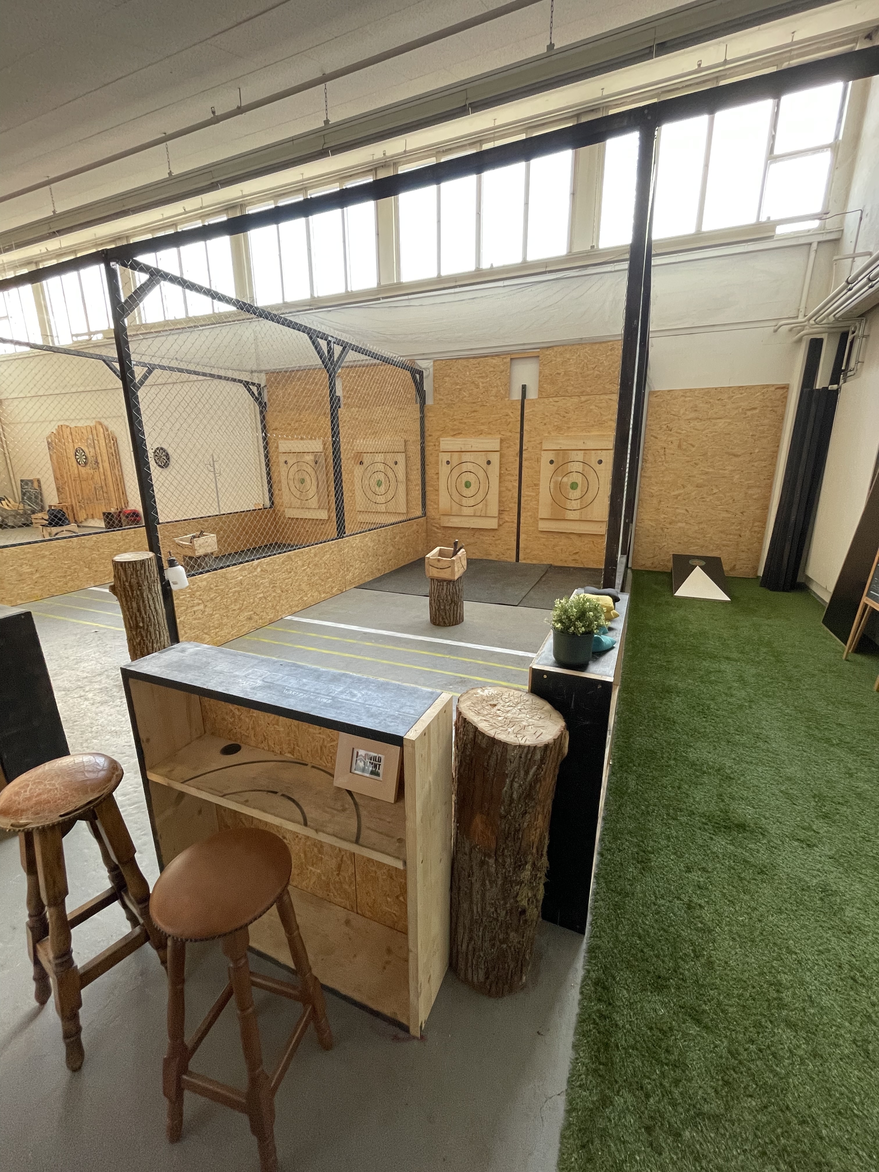 In Basel steht die erste Axt Bude der Schweiz, wo sich Freunde des kompetitiven Spiels in einer rustikalen, urbanen Umgebung treffen, ein paar Äxte werfen und am Ende einen Sieger ermitteln können. Spass, Leistung und Geselligkeit stehen gleichermassen im Vordergrund. Geworfen wird dabei mit kleinen Forstäxten bis 40cm aus knapp 4m Distanz auf eine Holzzielscheibe. Das Bulls-Eye in der Mitte und verschiedene Ringe markieren dabei die zu erzielenden Punkte. Ein Axt Coach sorgt für Sicherheit, wobei einer jeder Gruppe zugeteilt wird. Er führt ein Safety Briefing durch, instruiert die Technik, leitet ein kleines Turnier und gibt hilfreiche Anweisungen.