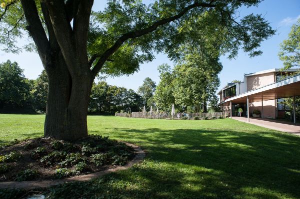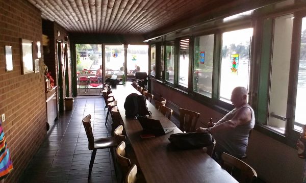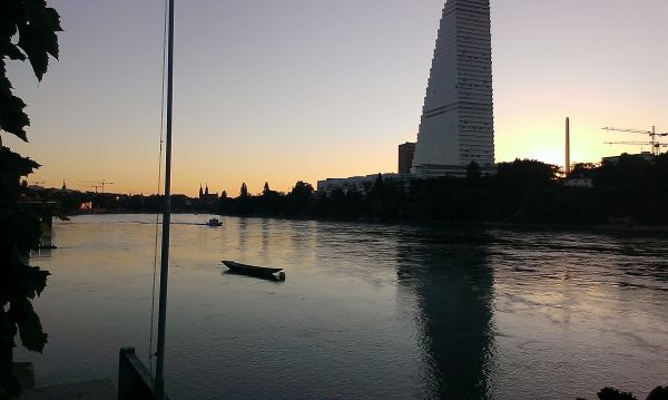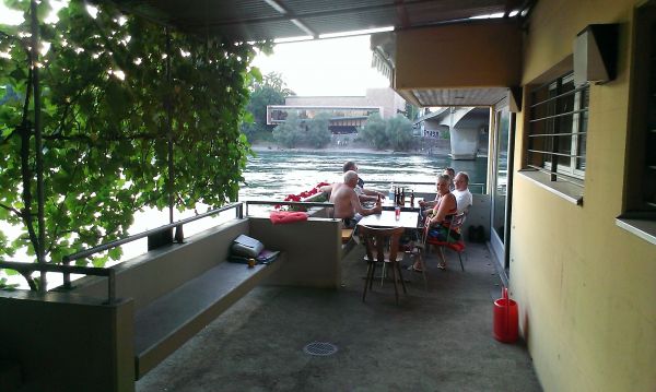 Clubhaus direkt am Rhein auf Grossbasler Seite mit überdeckter Terasse und Rasenfläche.