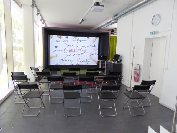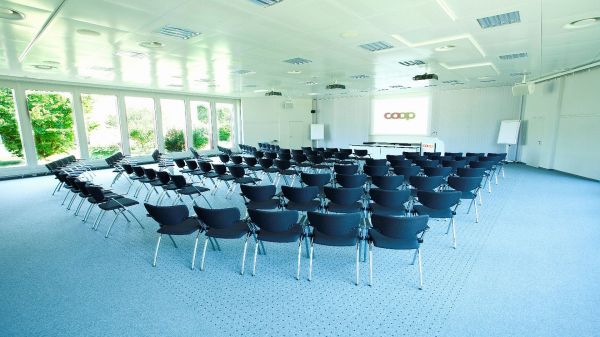 Die grossräumige Aula mit Regieraum, Übersetzerkabine und Dreifachprojektion eignet sich bestens für Grossveranstaltungen jeglicher Art. Das Foyer kann als Empfangsbereich, für Pausen oder Apéros genutzt werden. Das Untergeschoss bietet vier praktische Gr ...