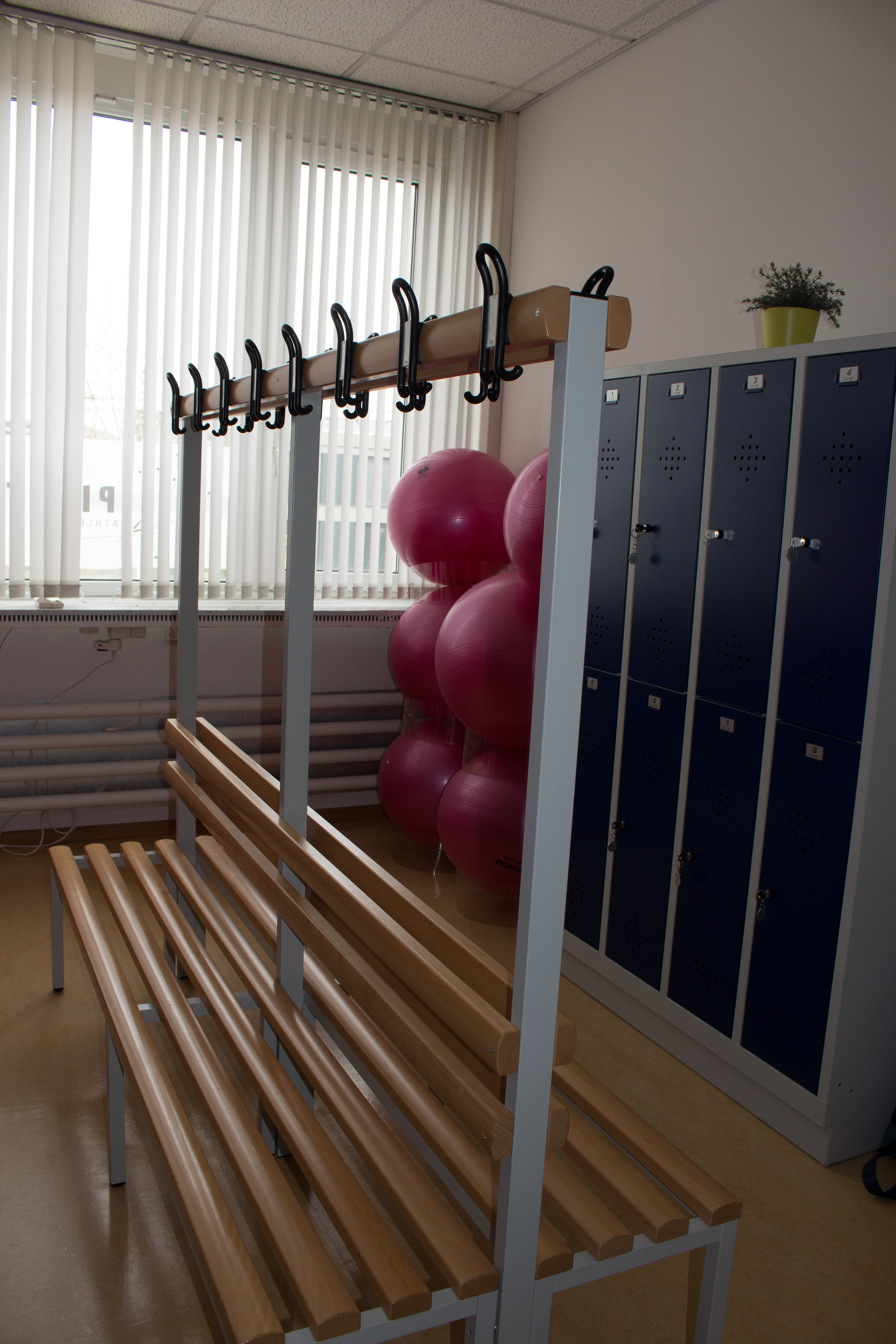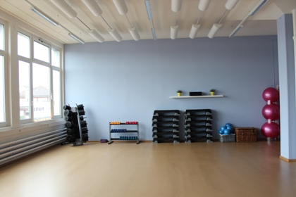 Ausgestattet mit Musikanlage, Airex Gymnastikmatten, Pilatesbälle, Foamroller, Yogamatten, Yogagurte und Blöcke, sowie Steps, Kurz-und Langhanteln.