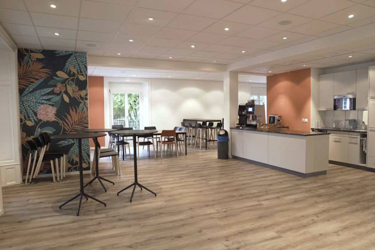 Die Cafeteria bietet Platz für bis zu 60 Personen, kann aber auch erweitert werden. Ideal auch für Sitzungen, für die helle Räume und Zentralität wichtig sind.