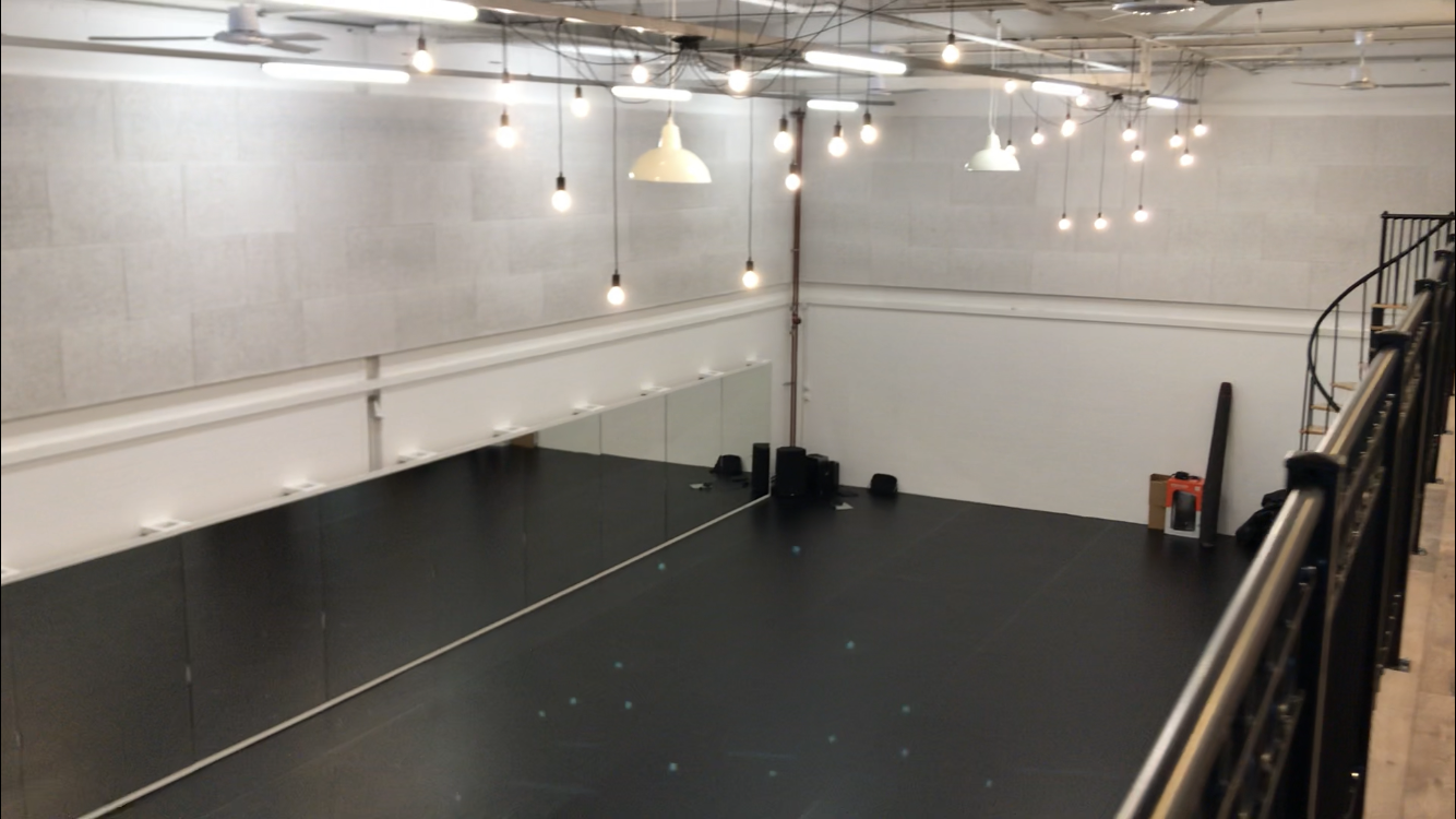 Das Dance Complex Studio verfügt über einen 172 Quadratmeter schwarzen Tanzboden mit 14m Spiegelwand, Empfang, Shop, Lounge und einer Garderobe.