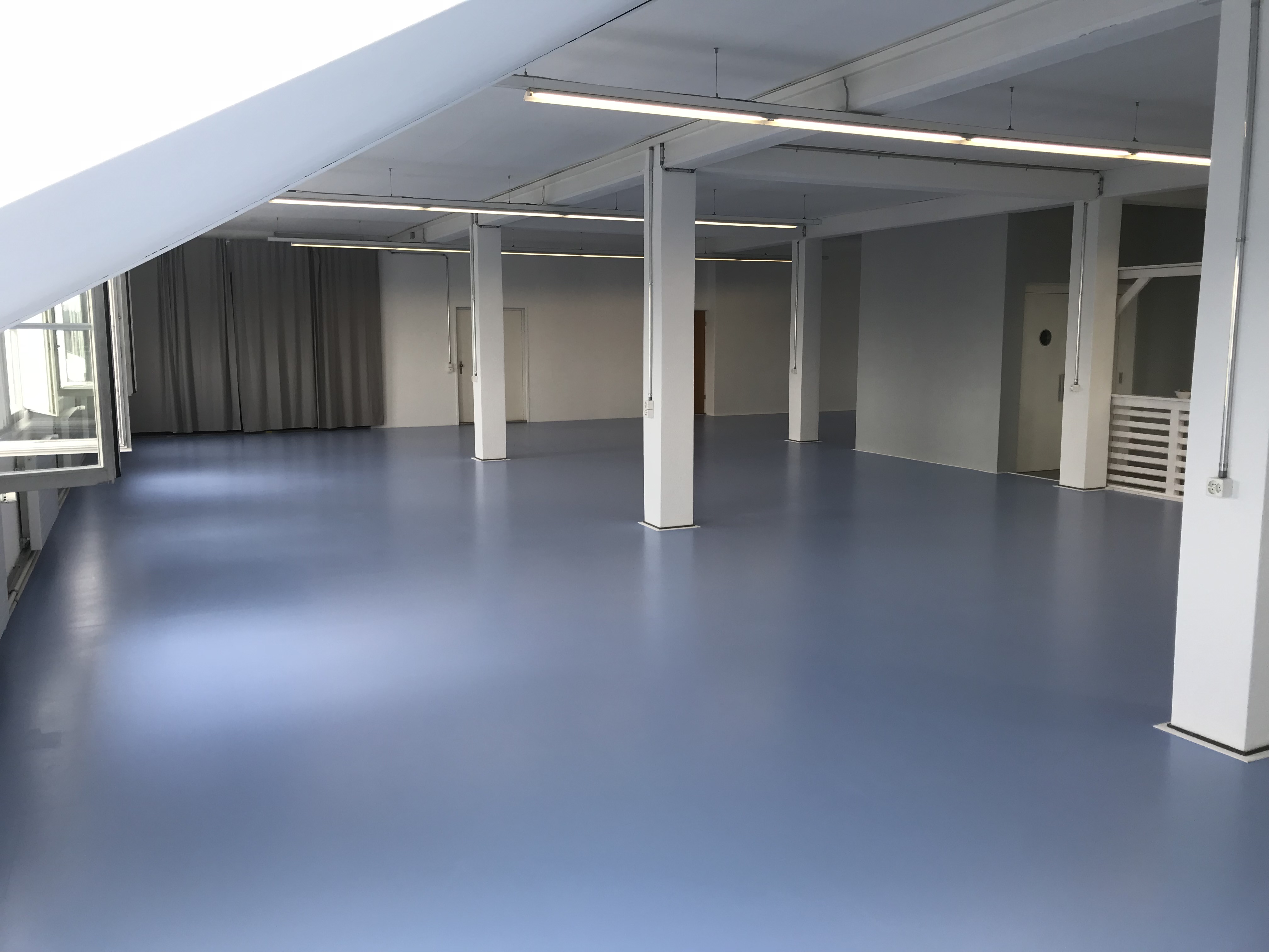Unser lichtdurchflutender Trainingsraum ist mit einem flächenelastischen Holzboden von ca. 220m² ausgestattet.