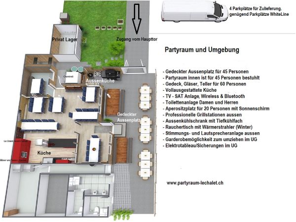 LU/ZG/SZ Meierskappel Der Partyraum ist für. 45 Personen bestuhlt.. Im Innenraum ist absolutes Rauchverbot. Gedeckter Aussenbereich für 45 Personen,oben. Das Cheminée mit sep. Abluft und Zuluft gibt insbesonders im Winter die nötige festliche Stimmung. ( ...