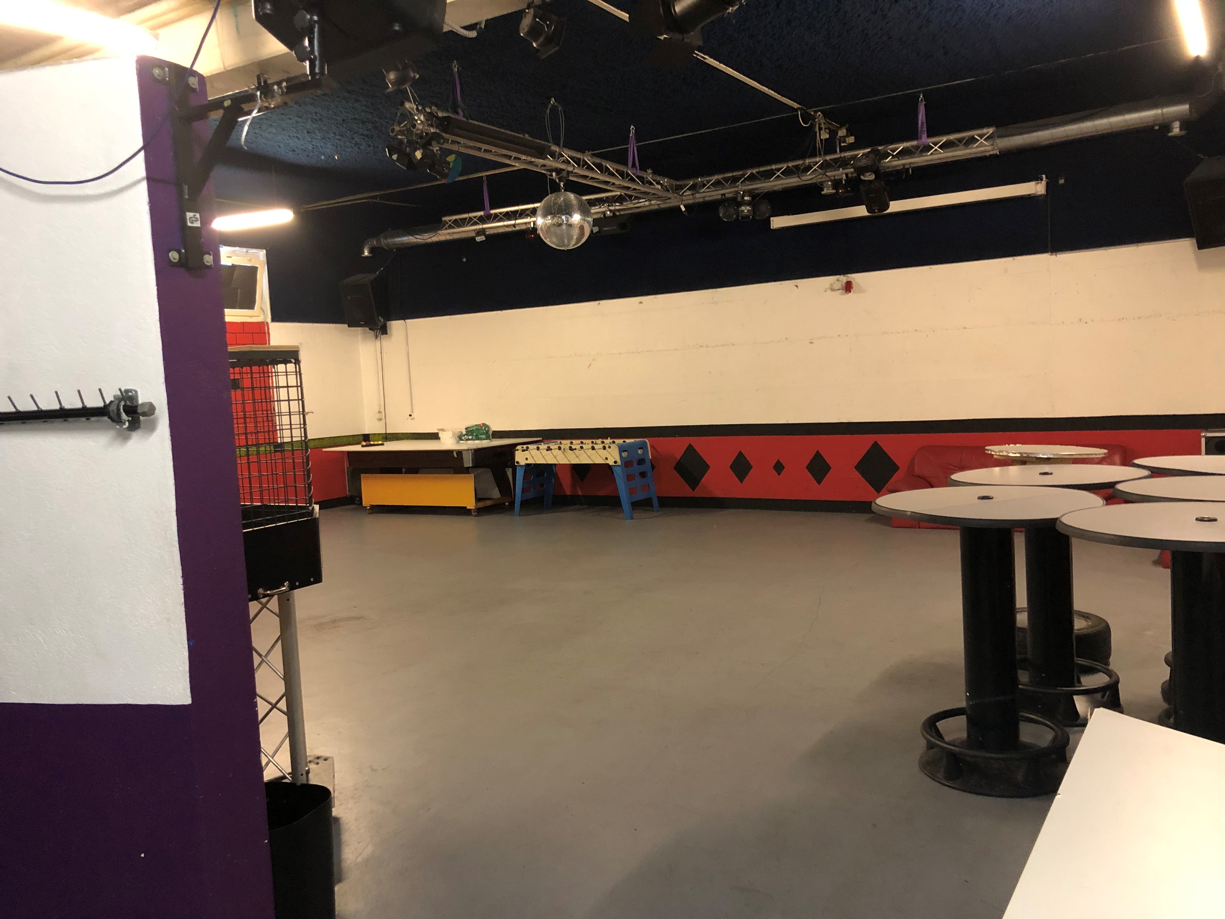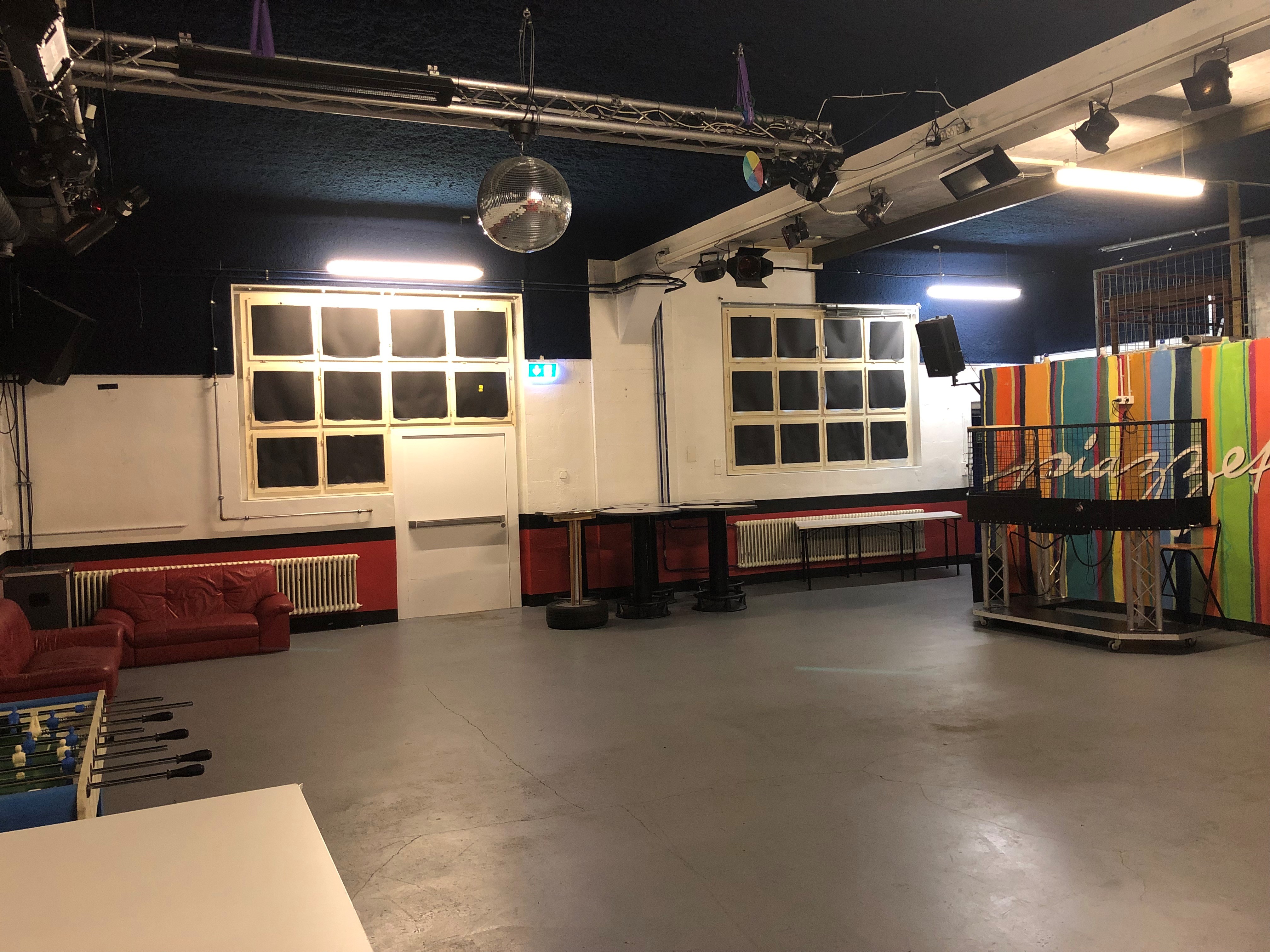 Party- und Discoraum mit kompletter Licht- und Musikanlage. Mit Bartheke und mobilem DJ Pult. Auch eine kleine Bühne steht bei Bedarf zur Verfügung, der Raum ist also auch für kleine Konzerte geeignet. Der Raum ist hoch und Schallgedämmt und befindet sich im Gewerbegebiet.