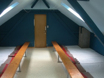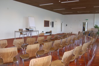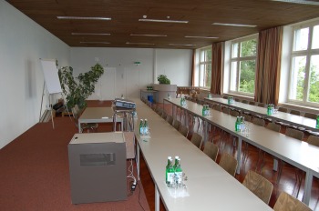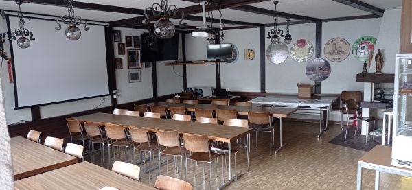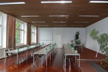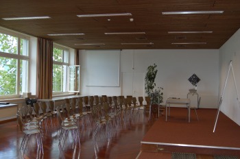 Länge 16,7m, Breite 10m Hoher Raum. Auf ganzer Länge links Fensterfront mit elektrischen Rollläden zum Verdunkeln. Nutzung als Seminarraum, Rartyraum, Tanzraum, Konzert, Spielen: Kegeln, Ping-Pong etc.