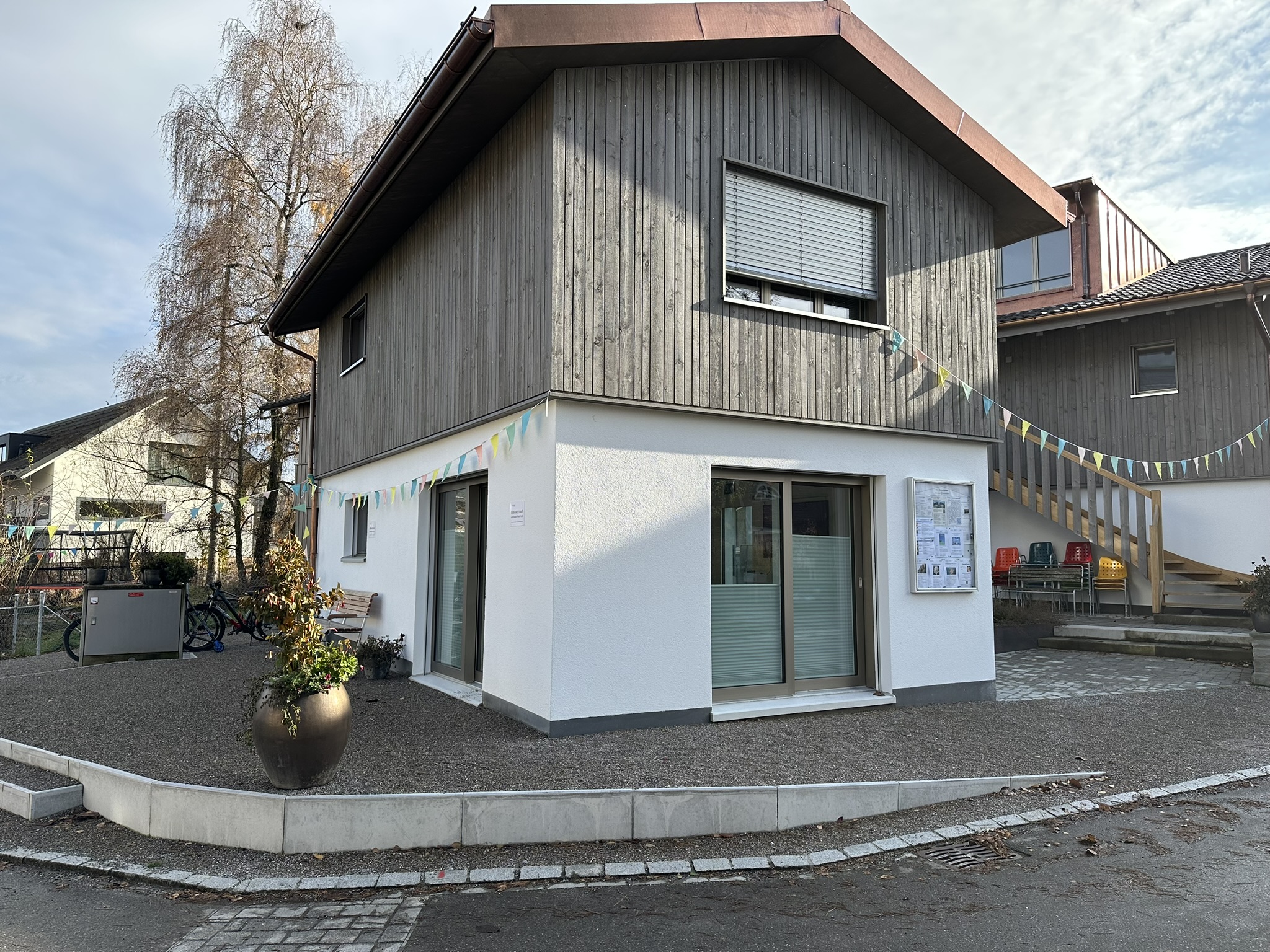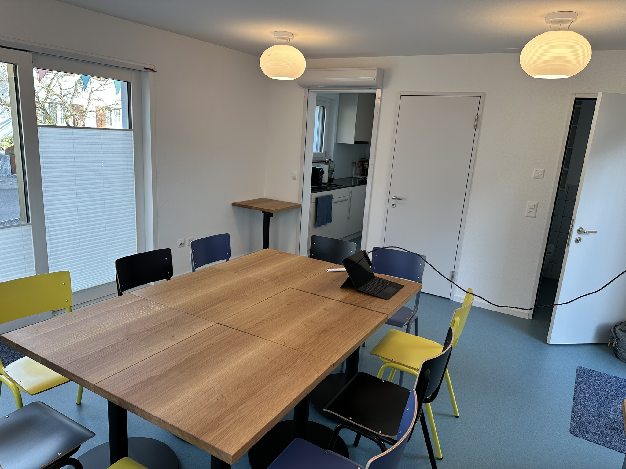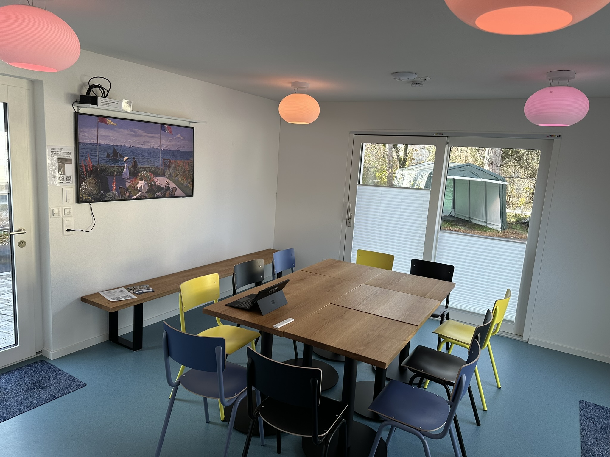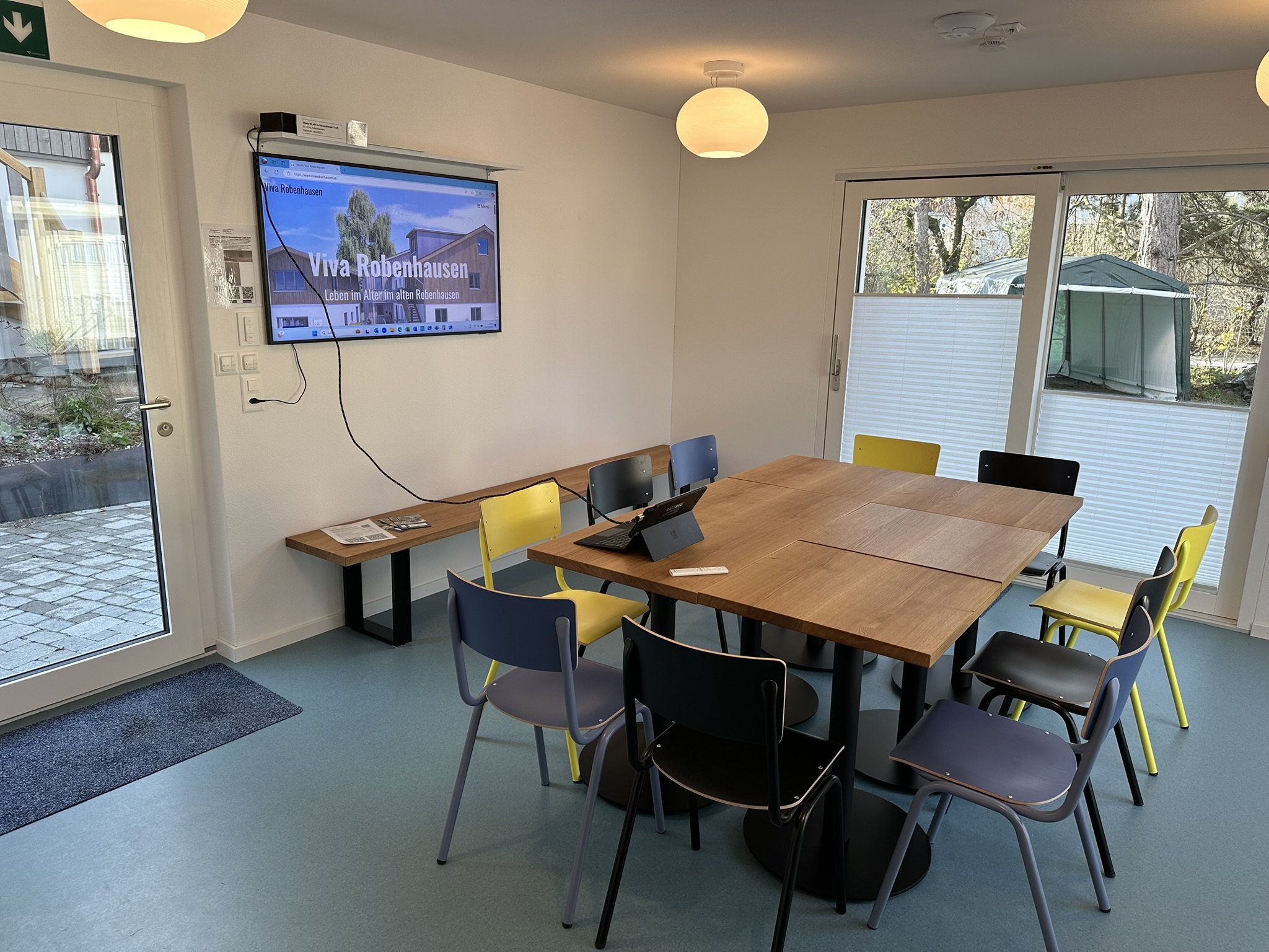 Der neue erbaute und modern und herzlich eingerichtete Generationen-Treff (GT) in Robenhausen gehört zum Angebot von Viva Robenhausen. Der Raum ist mit einem grossen Monitor ausgestattet und hat ausreichend Fläche für kleinere Workshops, Vorstandssitzungen, Eigentümerversammlungen, Retraiten, kleine Familienfeste oder ähnliches. Der multifunktionale Raum von knapp 25 m2 für maximal 20 Personen bietet zudem eine kleine Küche mit Geschirr, Tee/Kaffee, WC, Ambiente-Beleuchtung und die passenden Tische & Stühle. Der Raum ist mit einer besonders hochwertigen Schallschluckenden Decke ausgestattet. Der unmittelbare Aussenraum kann mitbenutzt werden und bietet zusätzlichen Platz. Im Sommer oder bei Bedarf mit Tischen, Stühlen und Sonnenschirm ausgestattet.